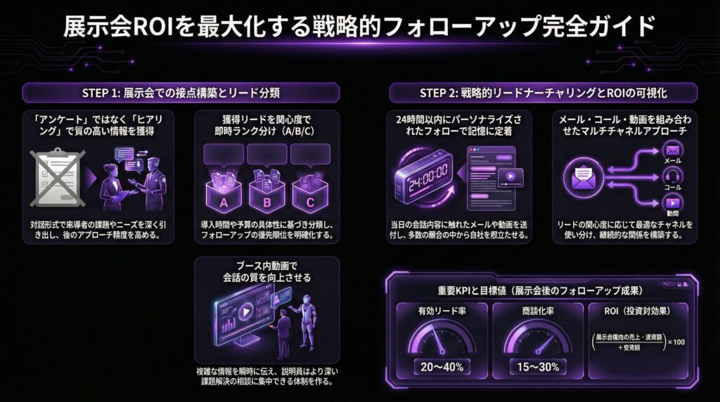 本記事では、展示会後フォローの全体像を5段階で整理し、48時間以内に必ずやる初動、セグメント別のメールと電話の進め方、要件整理表で商談を前に進める方法、動画と資料でのナーチャリング、CRMの最低限ルール、2週間と1か月で回す改善サイクルまでを体系化します。